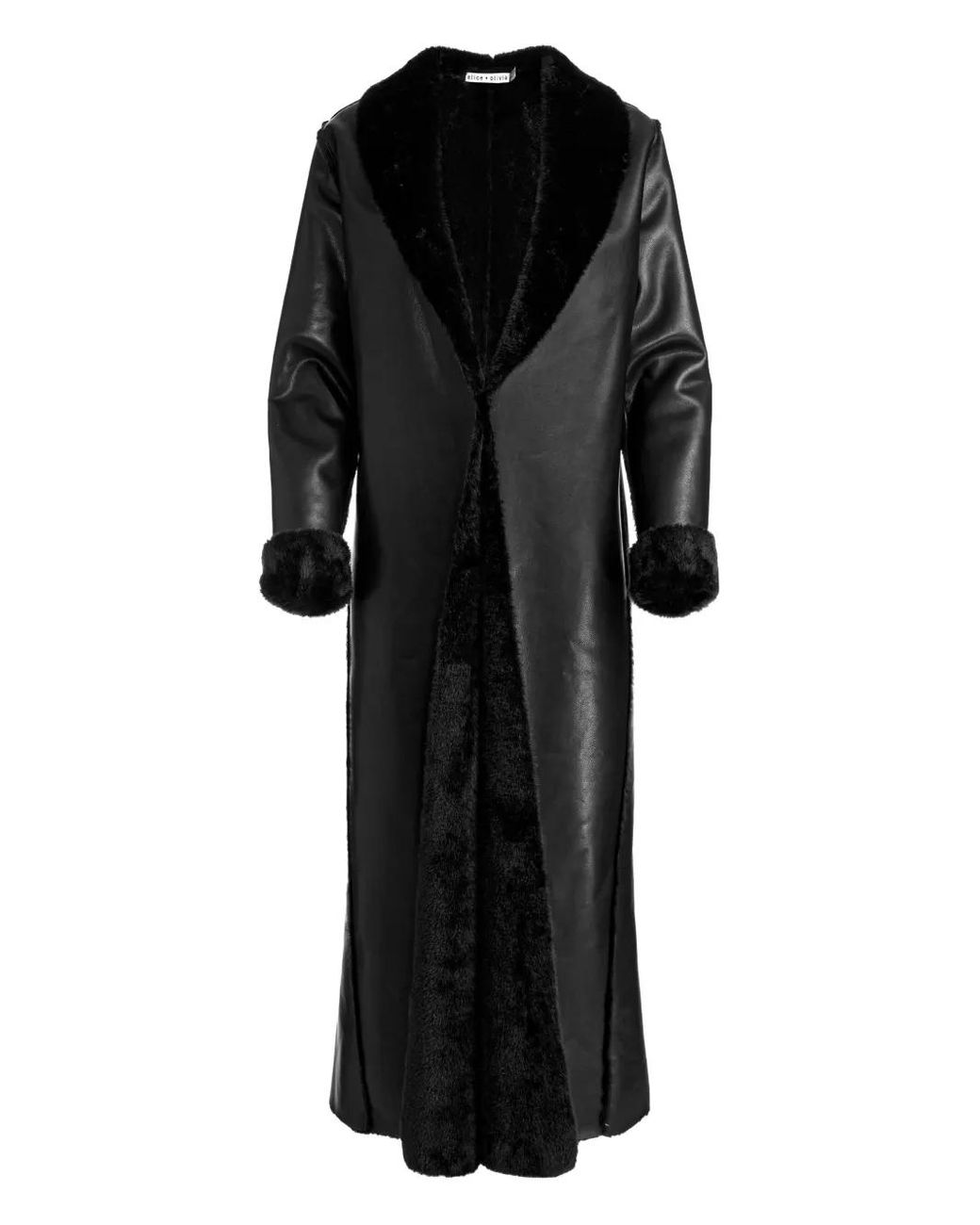 Black maxi length faux shearling collar and cuffs open front long sleeves Size: L. Gender: Female. Material:Polyurethane. Colour: black