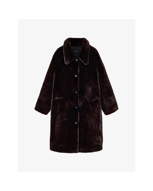 AllSaints faux-fur coat100% polyesterExposed button fastening at frontRelaxed fit, collared, long sleeves, two pockets at the sideDry cleanTrue to sizeModel is 5ft 11in/1.80m and wears a size UK 8Heavyweight, non-stretch Colour: black