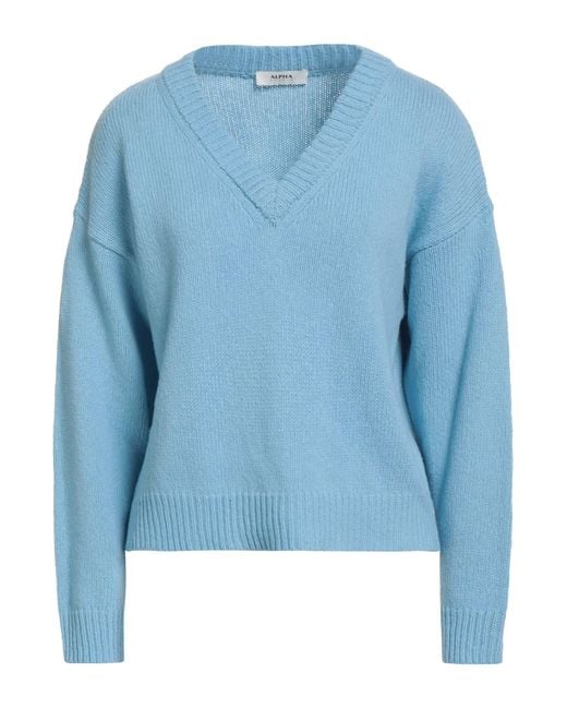 ALPHA STUDIO. wool, medium-weight knit, plain colour, no appliqués, v-neck, long sleeves, hand wash or dry clean, do not bleach, do not tumble dry. 100% Merino Wool. Colour: blue