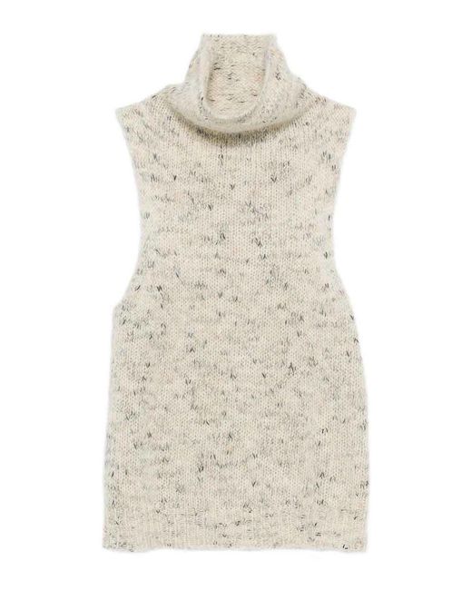 Beige, turtleneck, sleeveless, speckled pattern. Colour: natural