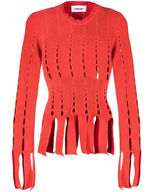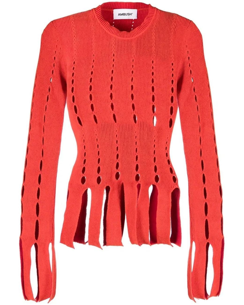 Sunset orange cotton blend cut-out detailing round neck long sleeves frayed hem Size: M. Gender: Female. Material:Cotton/Viscose/Polyamide.