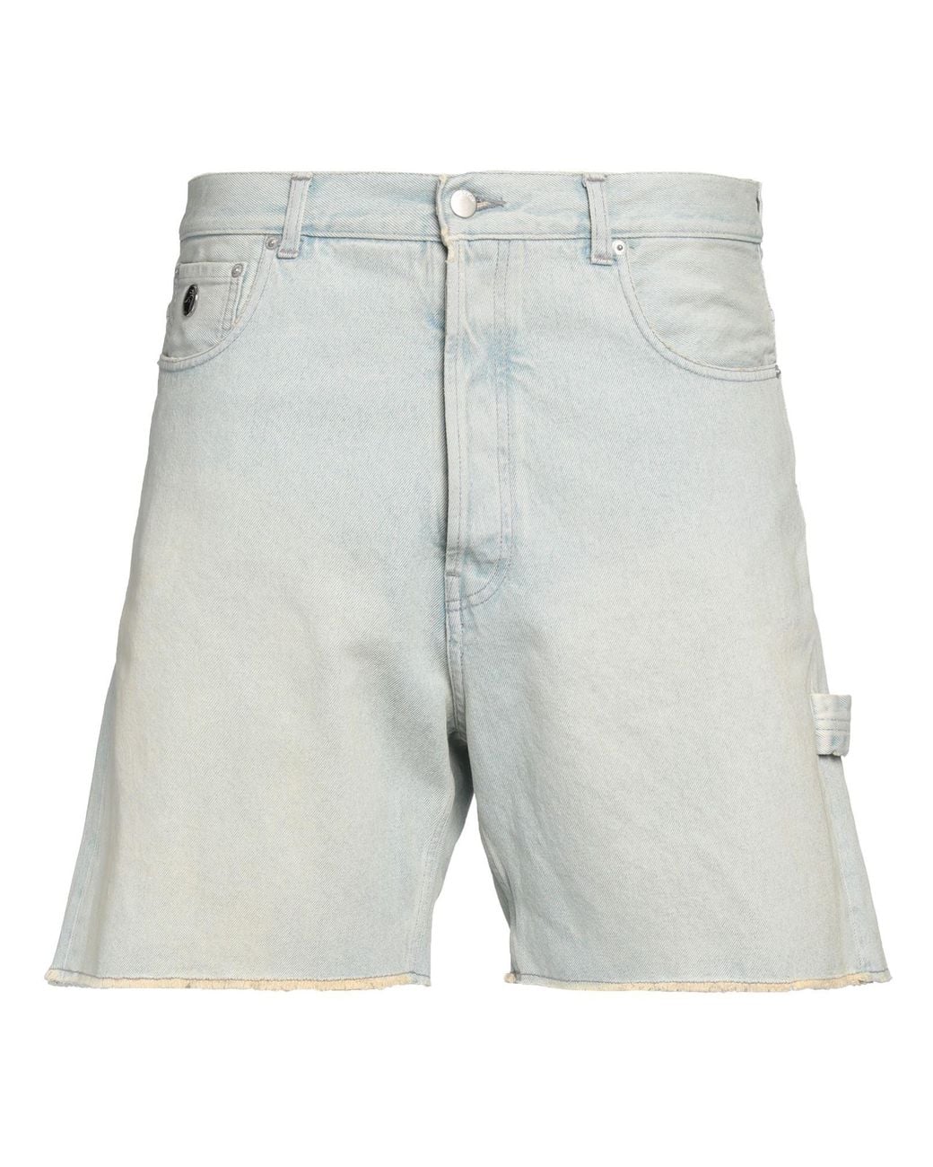 AMBUSH. shorts, denim, plain colour, embroidered logo, light wash, high waisted, belt loops, button fastenings, multipockets, machine wash or dry clean, do not bleach, do not tumble dry. 100% Cotton.