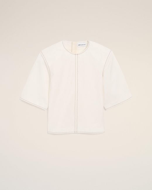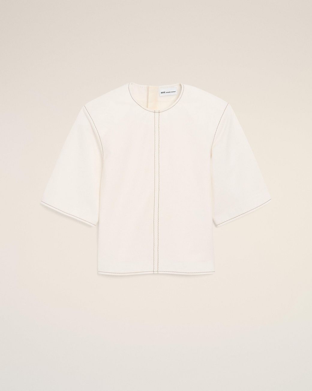 Product from a brand featuring a red heart logo with the letter A. Top with short sleeves in light cotton gabardine with bold contrasted topstitches. Slim fit