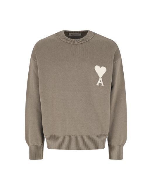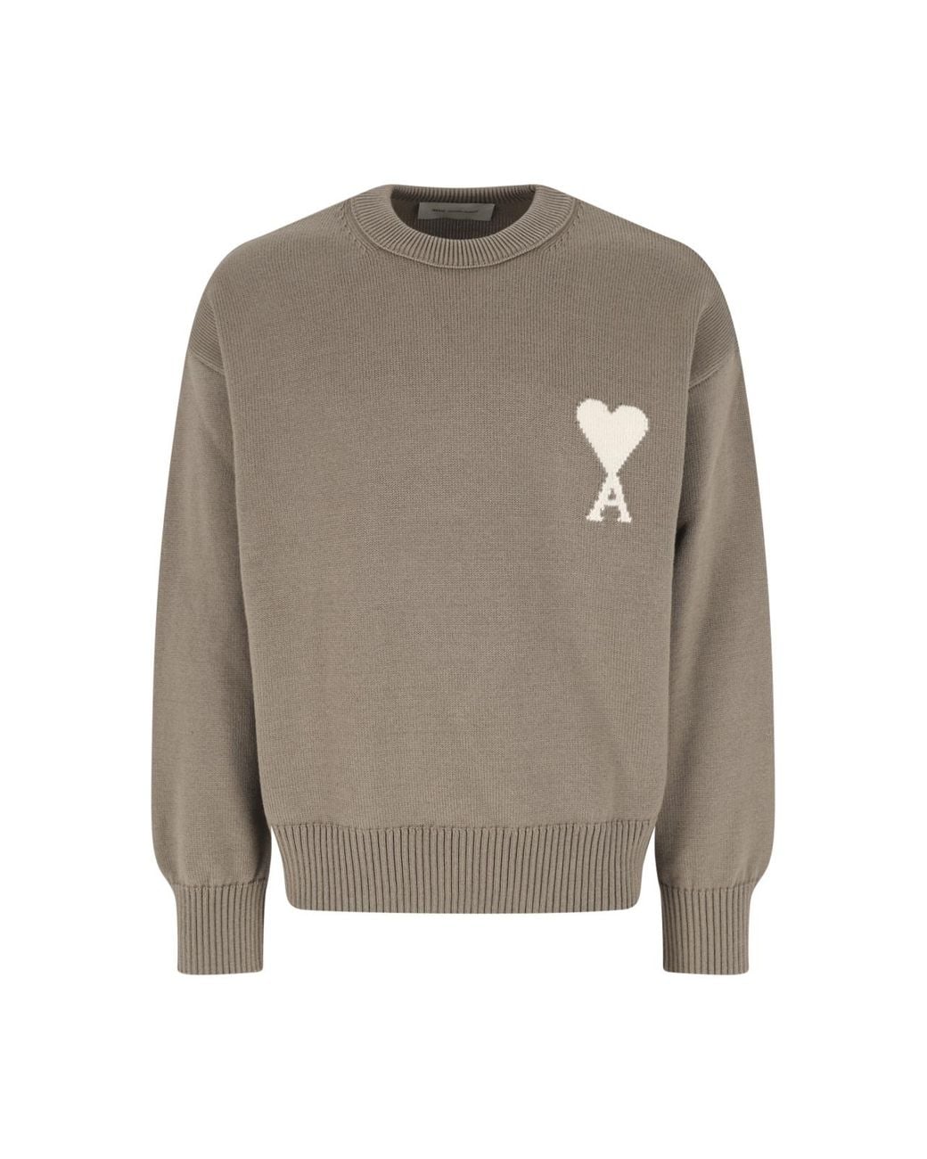 Crewneck pullover jumper in taupekhaki knit with ribbed collar, cuffs, and hem. Features the Ami de Cur logo an oversized intarsia heart with the letter A beneath in off-whitecream on the left chest. Relaxed silhouette with dropped shoulders and long sleeves. Colour: grey