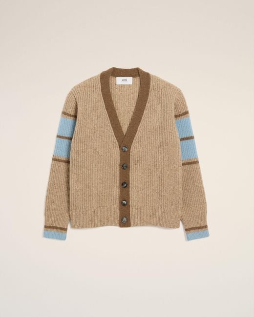 Product from a brand featuring a red heart logo with the letter A. Cardigan in university wool ribbed knit. "ami" engraved horn buttons