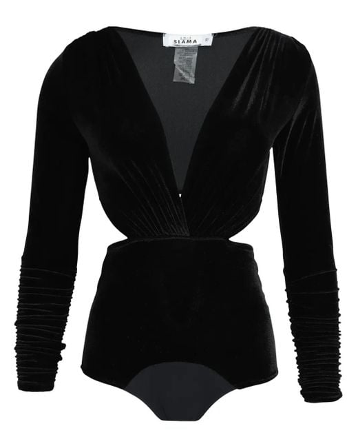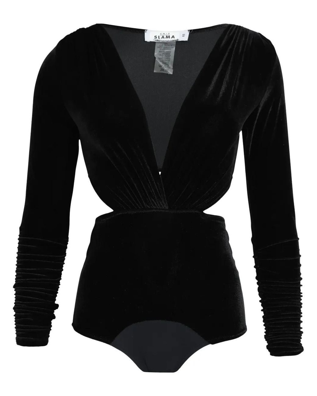 Black velvet stretch-design V-neck press-stud fastening long sleeves cut-out detailing draped detailing Just a reminder that this piece must be tried on over your own garments. Size: PP. Gender: Female. Material:Elastane/Polyester. Colour: black