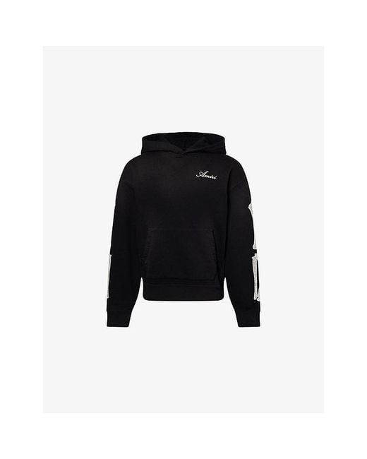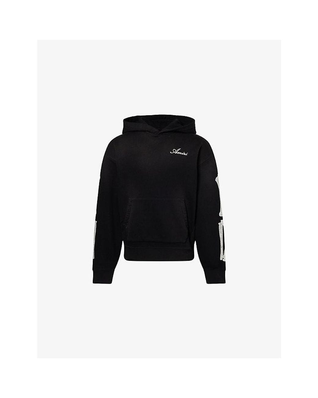 AMIRI cotton-jersey hoodie100% cotton; embroidery 100% polyester; lining 100% cotton; trims 95% cotton, 5% elastaneOversized, lined hood, bone embroidery at long sleeves, brand embroidery and kangaroo pocket at front, brand plaque at back, ribbed trimsDry cleanMade in ItalyModel is 6ft 2in/1.88m and wears a size mediumMidweight, stretchy Colour: black