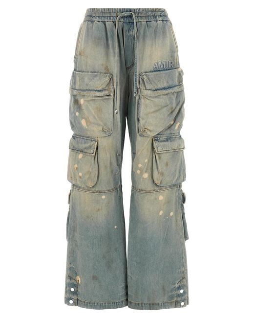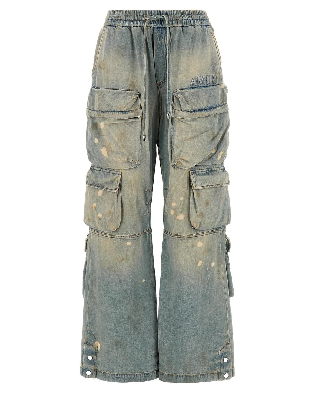 Stone washed cotton denim jeans with hand-aged paint stains, cargo style with pockets, high waist, front 3D logo embroidery, flared wide leg, drawstring elastic waistband, trompe loeil flap, knee pin tucks, leg bottoms with snap buttons, back logo tag. This garment has undergone a special process that has resulted in intentional variations in shades and colours that add unique characteristics to the garment.Composition 100 cotton Colour: blue