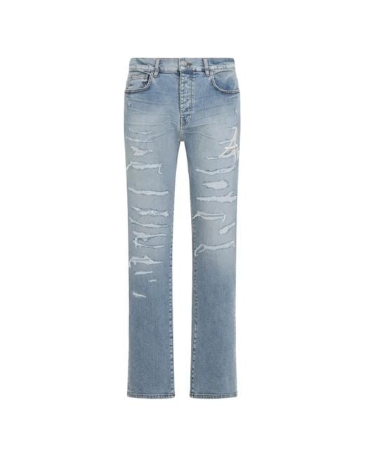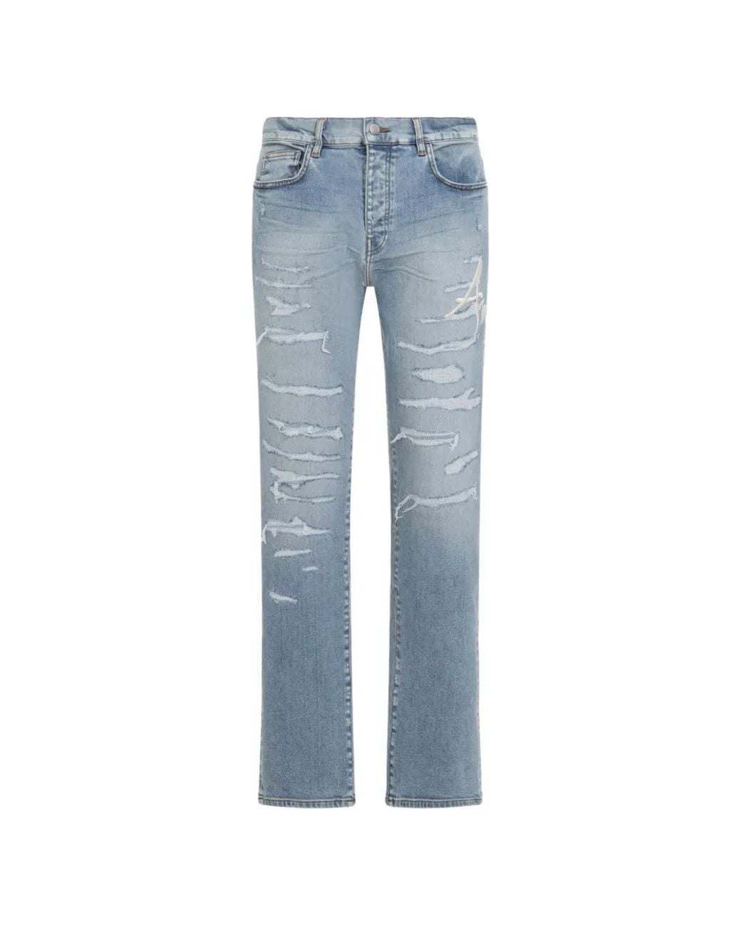Blue distressed effect signature embroidery five pockets belt loops button closure Size: 30. Gender: Male. Material:Cotton. Colour: blue
