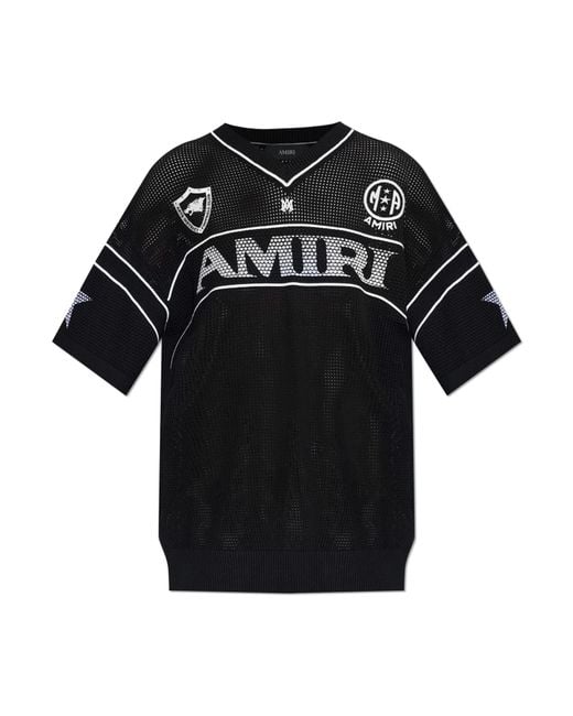 bold, large “AMIRI” logo stitched in white thread, as well as