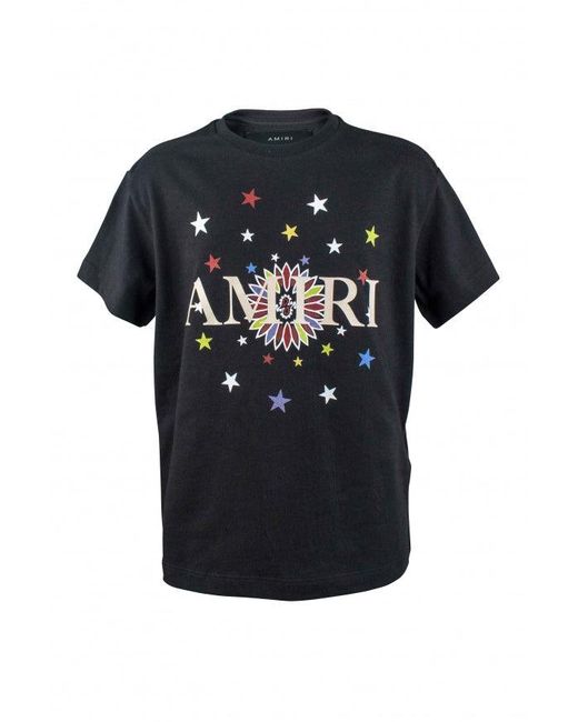 Black T-shirt in Amiri cotton. White logo print in center. Stars printed in several colors. Short sleeves. Made in Italy. Colour: black