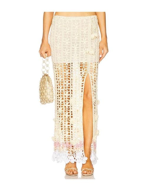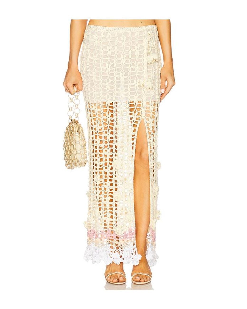 ANDREEVA Handmade Crochet Skirt in Cream. Size L. Also in XL, XS. ANDREEVA Handmade Crochet Skirt in Cream. Size XL, XS. 100% cotton. Imported. Dry clean only. Fully lined. Exterior self-tie floral drawstring closure. Front slit design. Pearl detailing throughout Garment is intentionally sheer, undergarments will show through. Please note undergarment not included. Waist to shortest hem measures approx 14.5 and to longest hem approx 44 in length. AREE-WQ6. 25007.