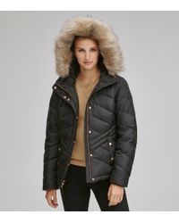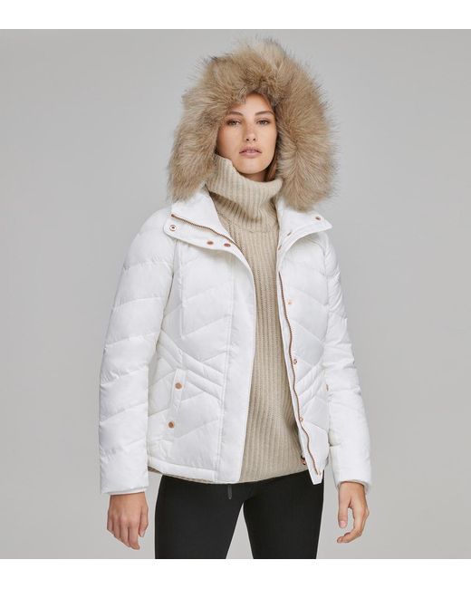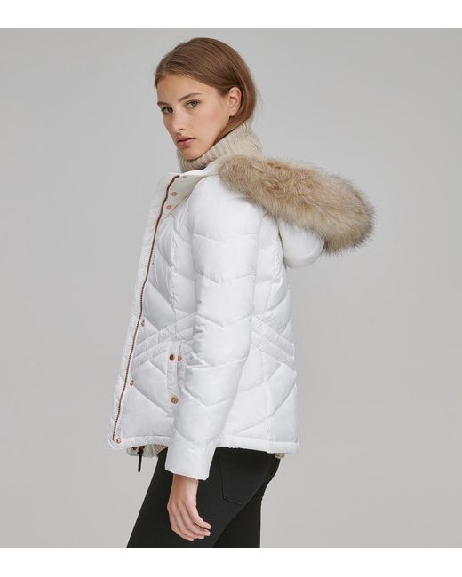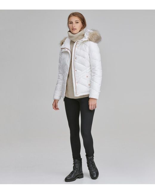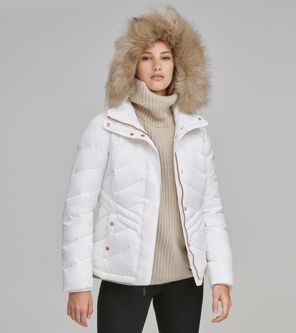 Merchandise indicated as "final sale" cannot be returned. View return policy below. Form meets function in our mallory coat. Crafted in a chevron-quilted, form-fitting matte fabric, the mallory is filled with 60/40 feather down for ultimate protection from the elements. The attached hood features a removable, tonal faux fur. A hidden drawcord on the interior of the waist keeps wind out when needed, while fleece storm cuffs and pocketing keep hands toasty. Rose gold hardware at front closure and pockets complete this cold weather look. Shell: 100% polyestershell/sleeve lining: 100% polyestershell fill: 60/40 down faux fur: 85% acrylic, 15% polyester4 exterior pocketsinterior pocketattached hoodfaux leather trimjacket: dry cleanhood: professional dry cleanmade in china. Colour: white