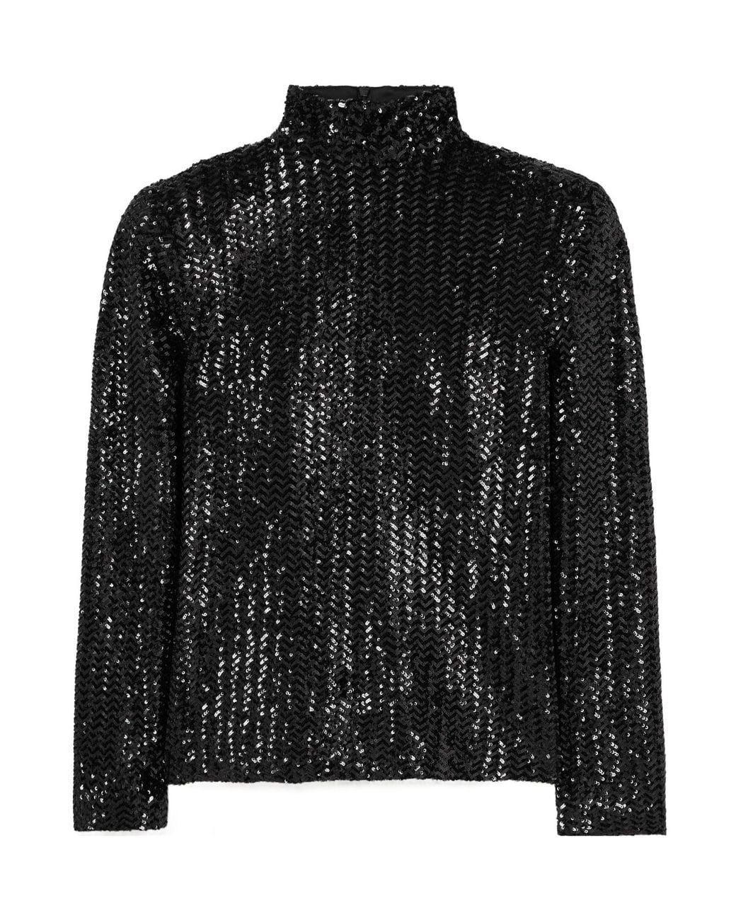 Long sleeves, mock neckline and sequined embellishments. Colour: black