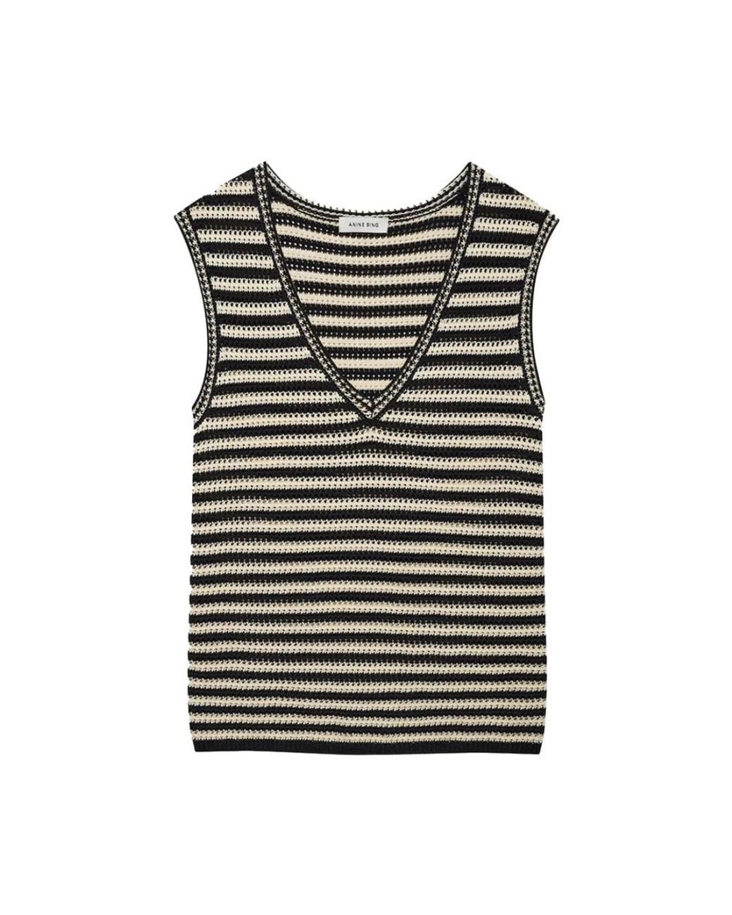 Anine Bing's Lowen Striped V-neck Vest is a knitted sleeveless jumper vest defined by a plunging V-neck and contrasting stripe trims. It’s designed for easy layering or worn alone as a statement piece. Key attributes: Black | Sort | Cotton | Mid-weight knit | Open knit | Breathable | Layering-friendly | Easy to style | V-neckline | Sleeveless | Striped pattern | Contrast trim | Dimensions & fit: Regular fit | Fits true to size | Composition & care: 70% cotton, 30% Eco Vero viscose | Hand wash Colour: black