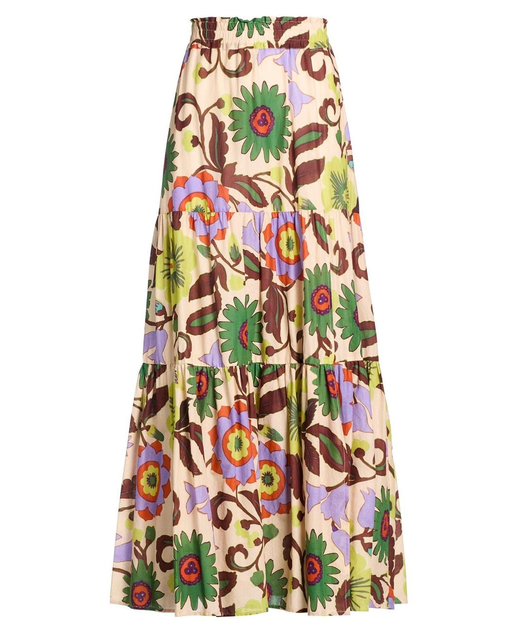 ANJUNA. flared skirt, woven, floral-print, gathered, elasticised waist, unlined, front slit, dry clean, do not bleach, do not tumble dry. 100% Cotton. Colour: white