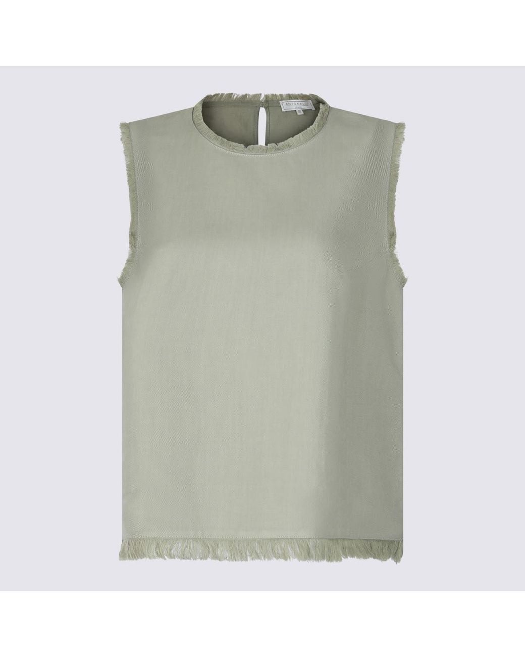 Green viscose and linen blend top from Antonelli Firenze featuring fringed hems, straight line, round neck, button closure at back and sleeveless line.Composition: _, 73% Viscose, 27% Linen Colour: green