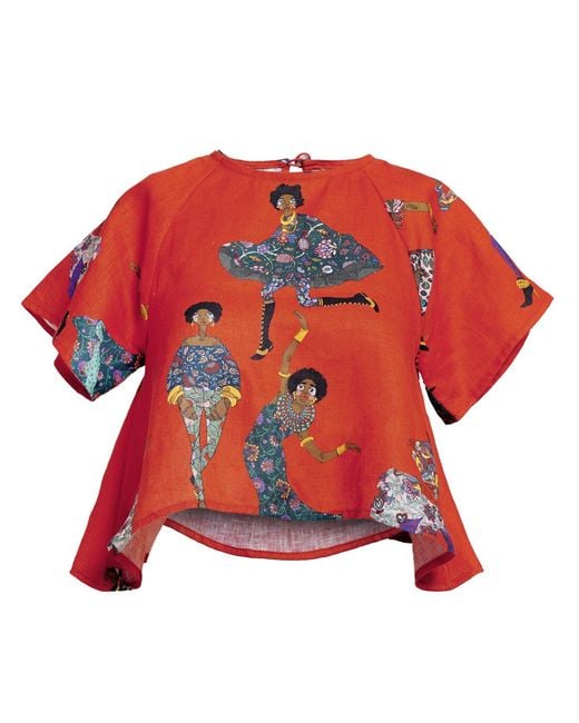 An elegant essential with a modern twist, the Lady Zuri Top features quarter sleeves and a relaxed, graceful fit. Finished with a delicate covered button closure at the back, it pairs effortlessly with trousers, skirts, or denim. Versatile and timeless, it’s perfect for elevated daywear or understated evening refinement. Afro Chintz Collection celebrates cultural richness, vibrant colour, and feminine strength. Each piece begins as a hand-illustrated artwork inspired by botanical chintz motifs and African-influenced patterns, transforming heritage and artistry into timeless wearable design. Dry clean only 100% Linen Linen 100% Colour: red