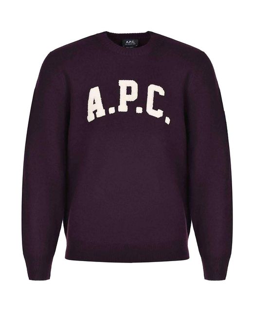 A.p.c. jay jumper made of soft virgin wool in plum colour. ribbed crew neck. long sleeves. contrasting white a.p.c. logo lettering on the chest. straight cut. 100% virgin wool. Colour: blue