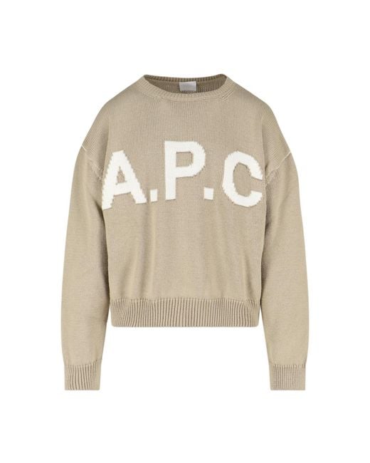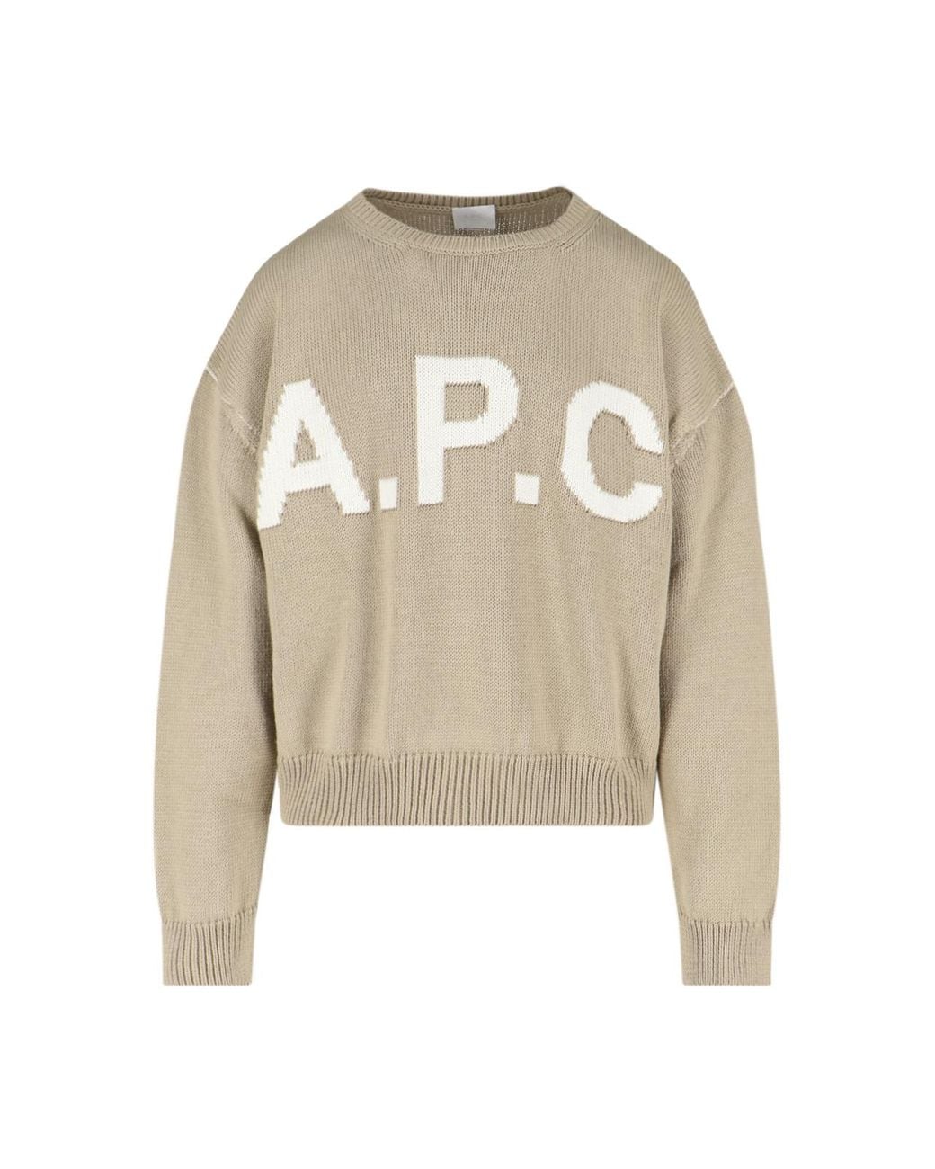 Crewneck jumper in beige knit with large-scale A.P.C. intarsia lettering in off-white across the chest. Features a ribbed crew neckline, ribbed cuffs, and a ribbed hem band. Drop-shoulder construction with raw-edge seam detail at the shoulder yoke, visible on both front and back. Colour: white