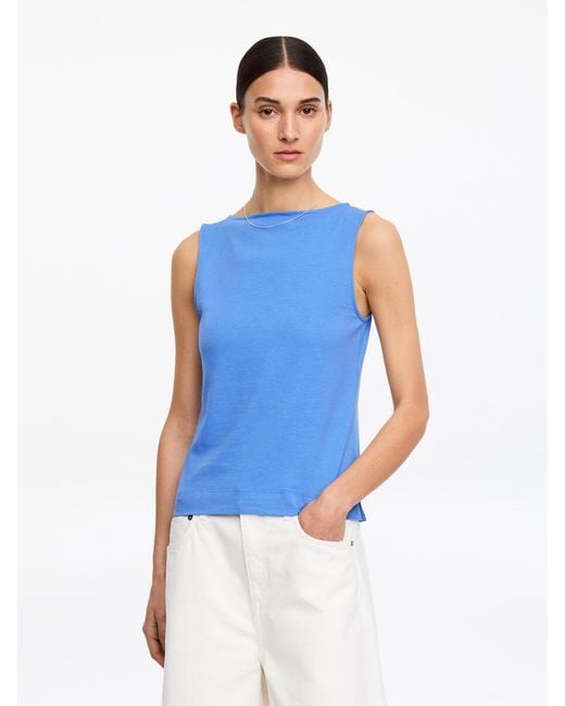 Fitted tank top in cotton with added elastane for stretch. A tight-fitted style with boat neck and slit at side seams. Colour: blue