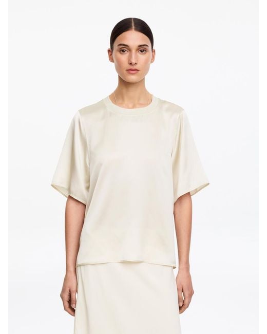 Timeless in design, this silk satin T-shirt is defined by its fluid drape and subtle sheen. Cut with softly dropped shoulders, it features a ribbed neckline, a vertical seam along the centre back, and side seam slits that allow for ease of movement. Colour: white