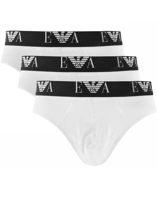 Emporio Armani Underwear 3 Pack Stretch Cotton Briefs In White. Three pairs of cotton stretch hip briefs with an elasticated black waistband which features the signature Emporio Armani logo in grey. 95% Cotton And 5% Elastane. Colour: black