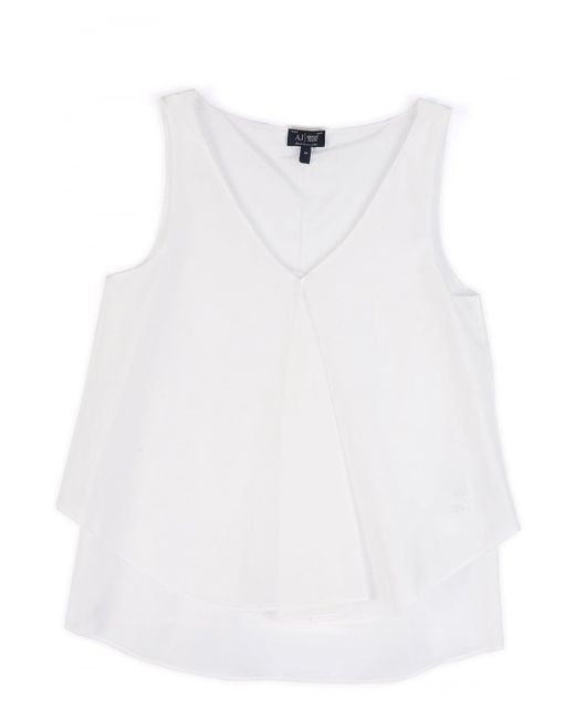 Armani Jeans Women's Sleeveless Top in white created with a silk-cotton blend, this layered blouse is perfect for day to night wear and a versatile staple piece for your wardrobe. A sleeveless v-neck design with a top layer split at the back, simple and elegant. Colour: white