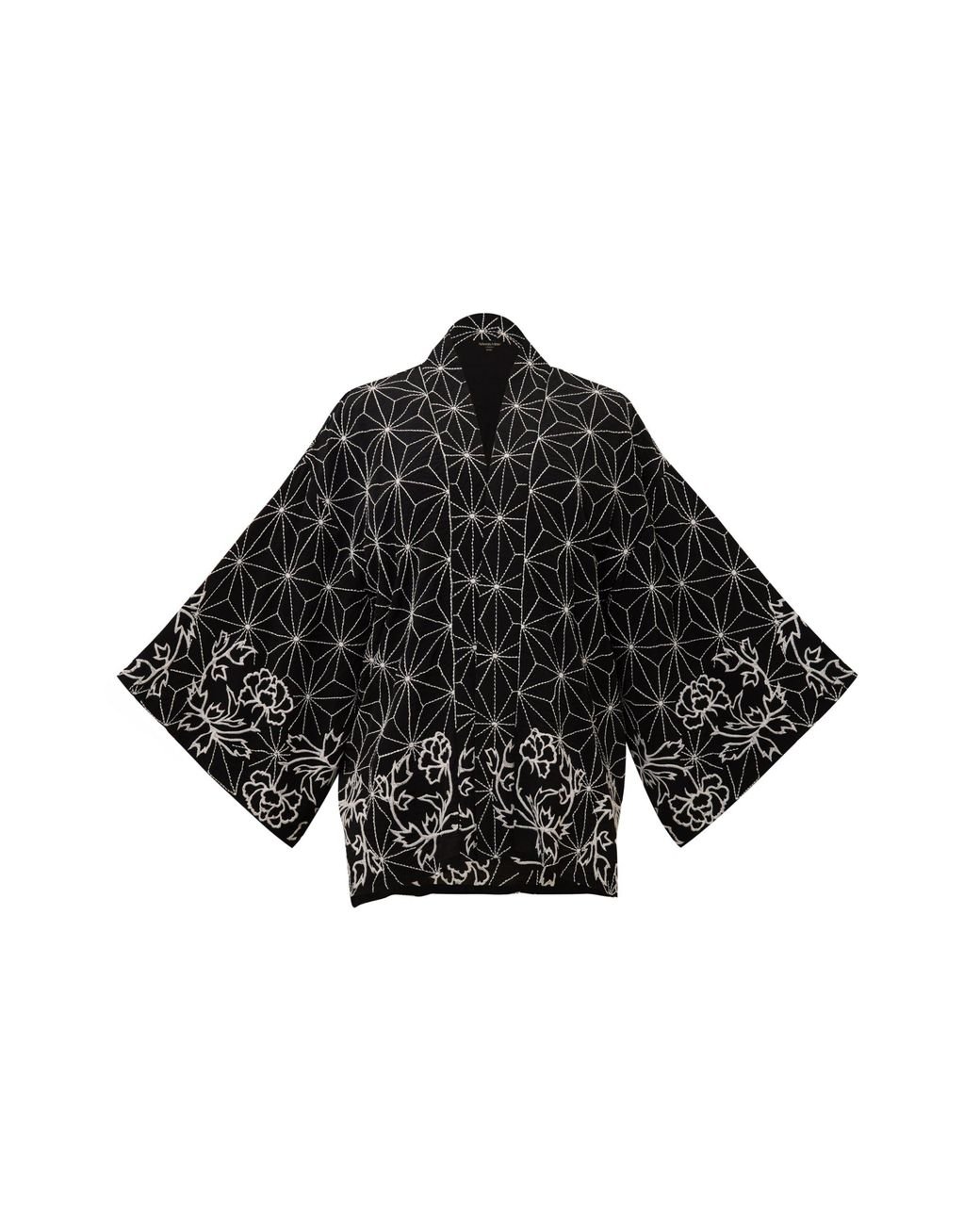 Women's Black Asanoha & Peony Embroidered & Ivory Fully Lined Short Kimono
