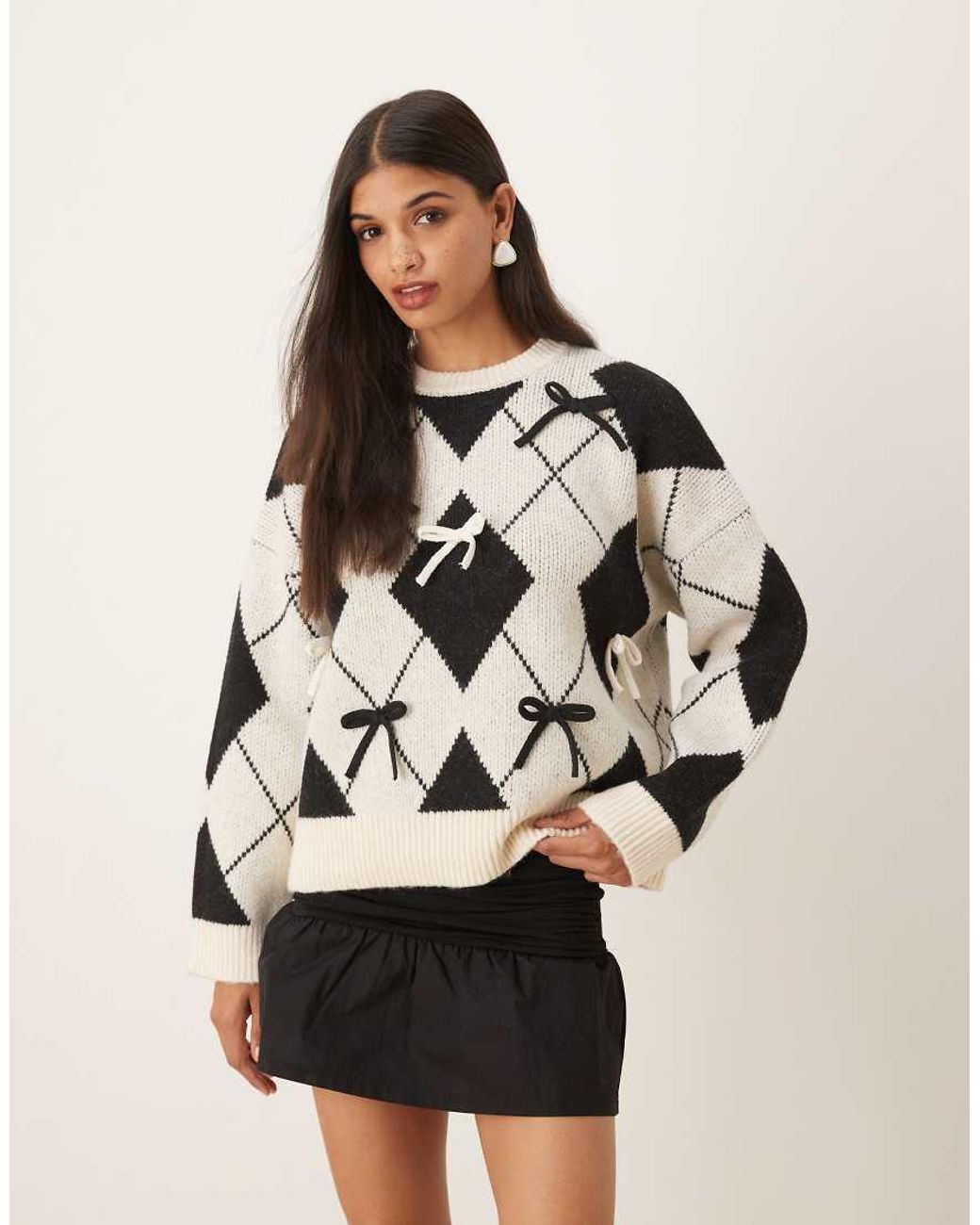 Jumpers & Cardigans by ASOS DESIGN Crew neck Long sleeves Drop shoulders Argyle pattern Ribbed trim Bow placement detail Oversized fit Colour: natural