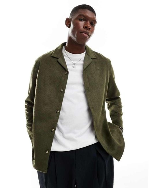 Men's Green Brushed Wool Look Overshirt With Revere Collar