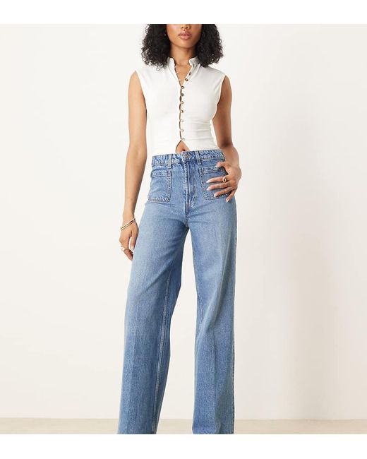 Asos Design Petite High Rise Wide Leg Jeans With Front Pockets In Mid - Blue