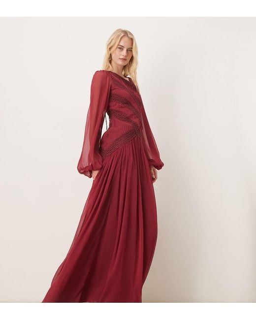 - Asos Design Tall Long Sleeved Asymmetric Neckline Maxi Dress With Lace Trim