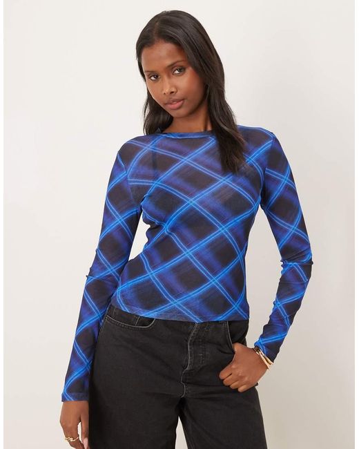 Tops by ASOS DESIGN Crew neck Long sleeves Sheer check print Slim fit. Cotton. Colour: blue