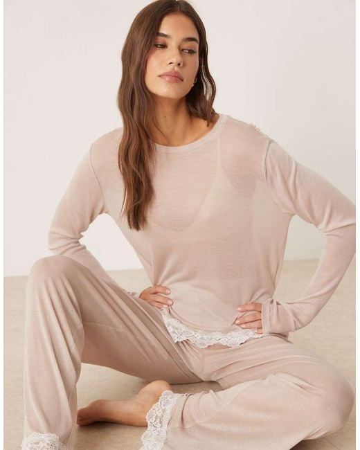 Lingerie & Nightwear by ASOS DESIGN Round neck Long sleeves Lace trim Regular fit This fabric is extremely delicate, please handle with care Colour: natural