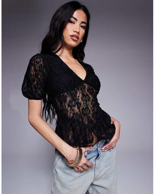 Women's Black Lace Puff Sleeve Seam Detail Top
