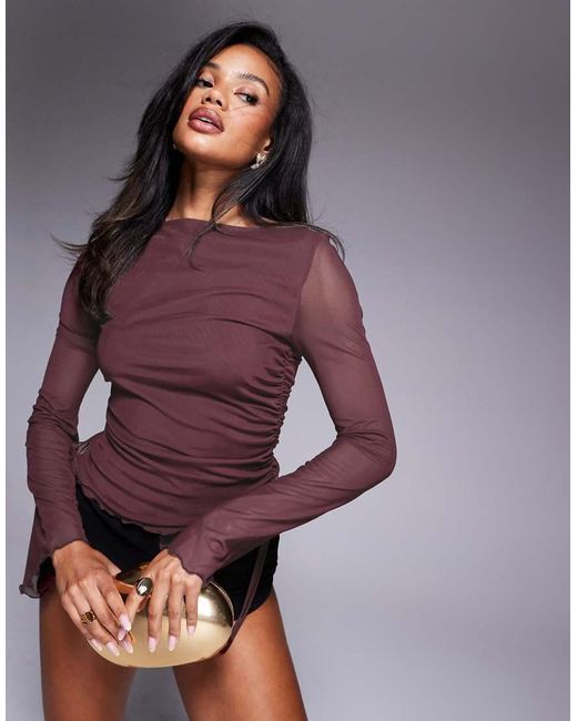Tops by ASOS DESIGN Plain design Boat neck Long sleeves Lettuce-edge trims Tie fastening at ruched side Regular fit. Polyester/Polyester/Polyester/Elastane/Polyester/Elastane. Colour: purple