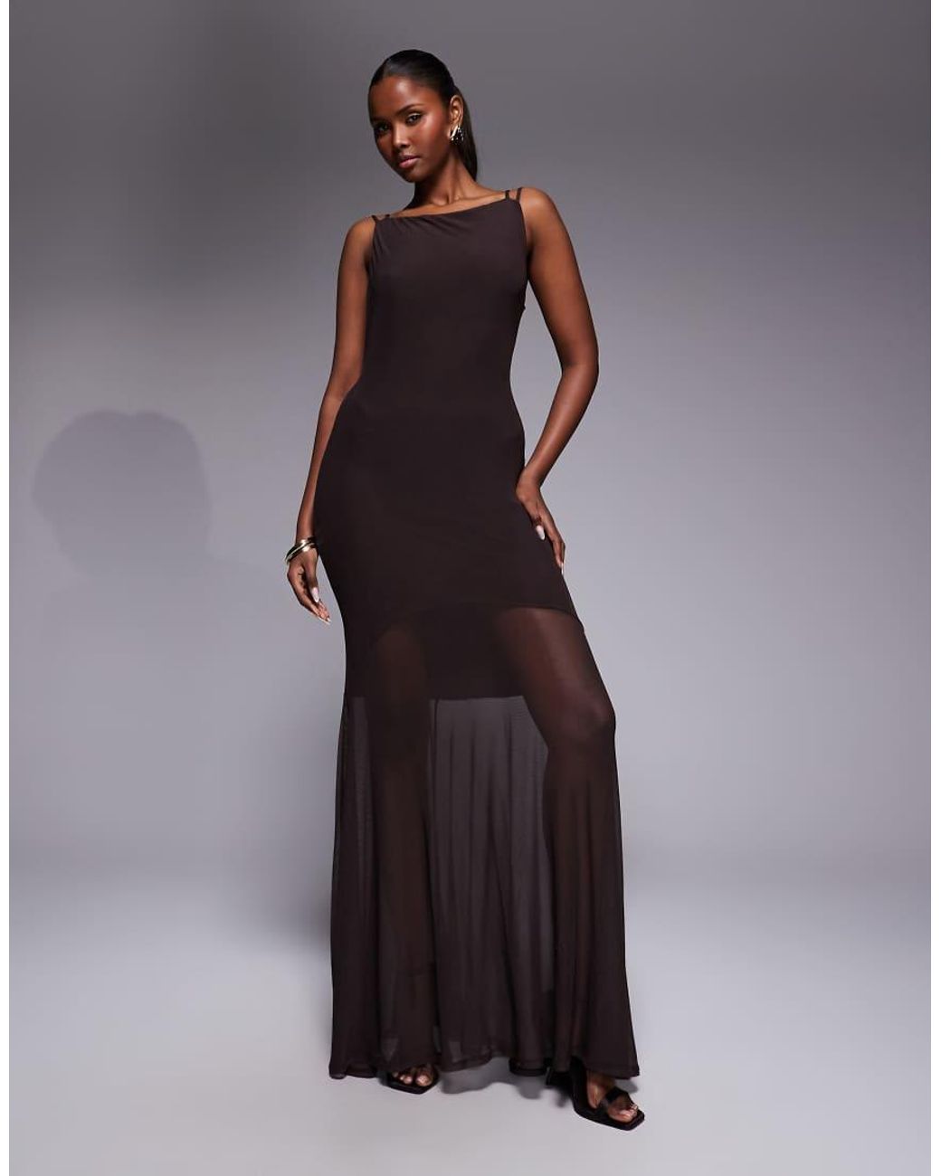 - Mesh High Neck Maxi Dress With Open Back And Double Strap Detail