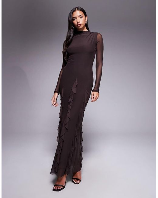 - Mesh Long Sleeve Maxi Dress With Waterfall Ruffle Skirt Detail
