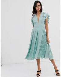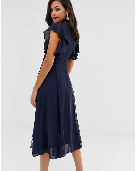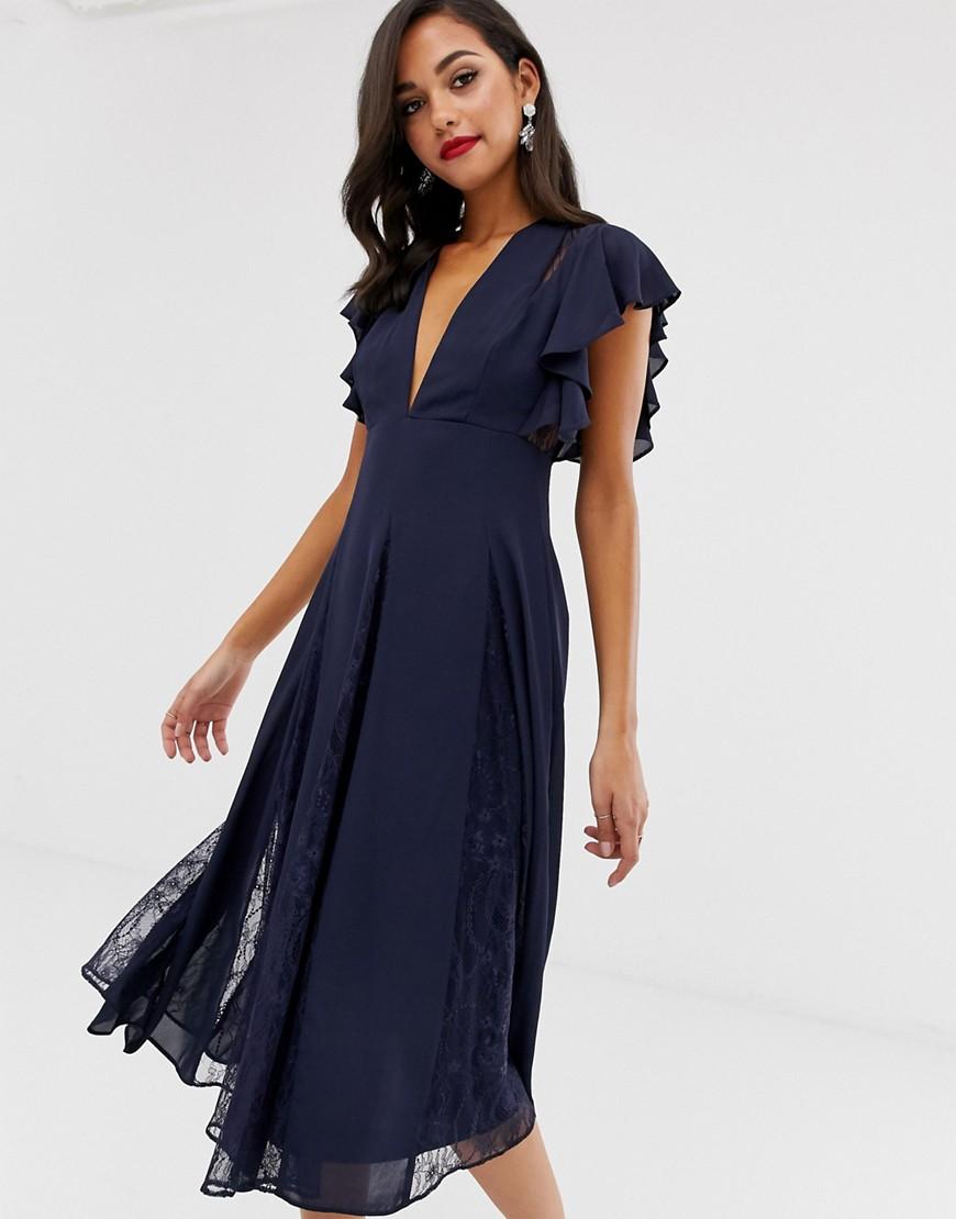 Dress by ASOS DESIGN, Worth making plans for, Plunge neck, Ruffle sleeves, Lace inserts, Zip-back fastening, Regular fit, Just select your usual size. This is ASOS DESIGN ' your go-to for all the latest trends, no matter who you are, where you're from and what you're up to. Exclusive to ASOS, our universal brand is here for you, and comes in all our fit ranges: ASOS Curve, Tall, Petite and Maternity. Created by us, styled by you. Colour: blue