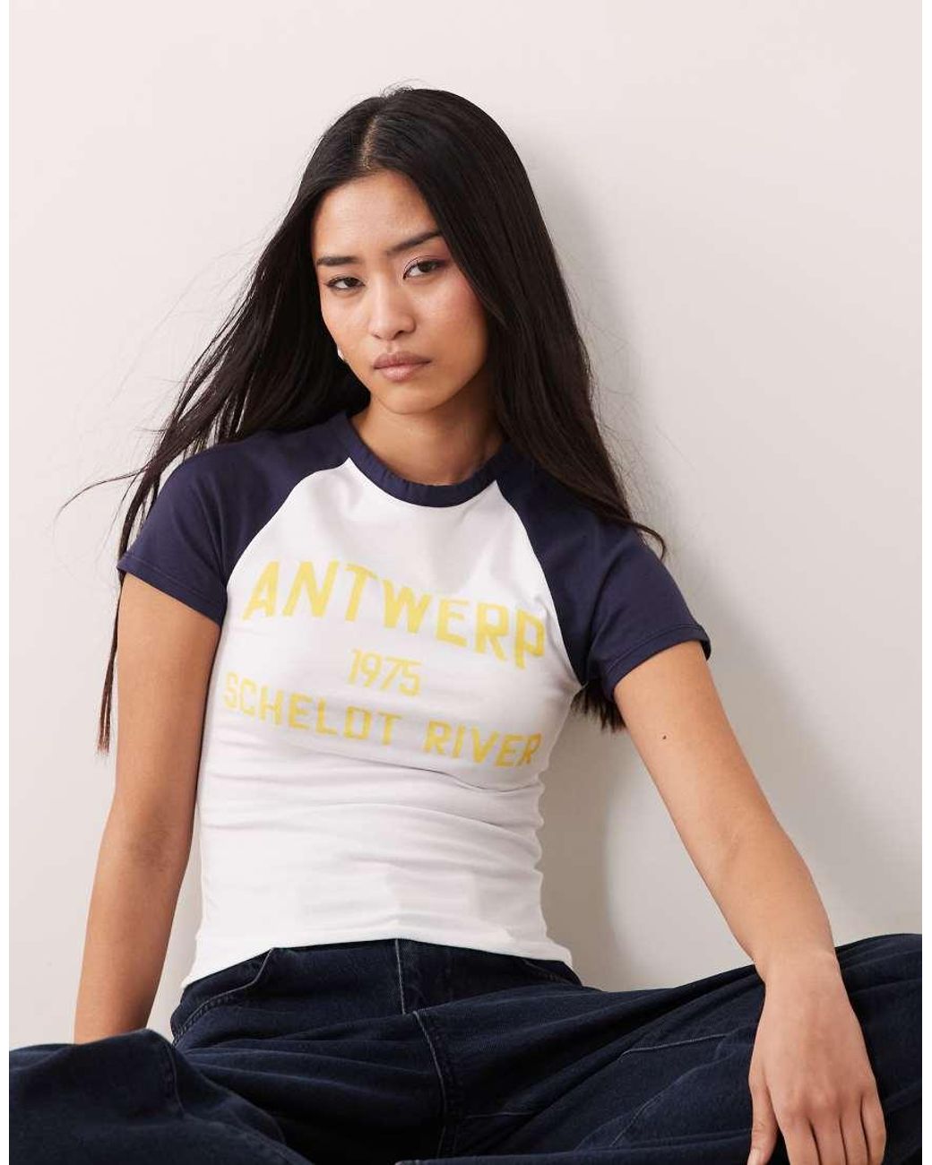 Tops by ASOS DESIGN Crew neck Raglan sleeves Antwerp location text print on front Slim fit. Cotton/Elastane. Colour: white