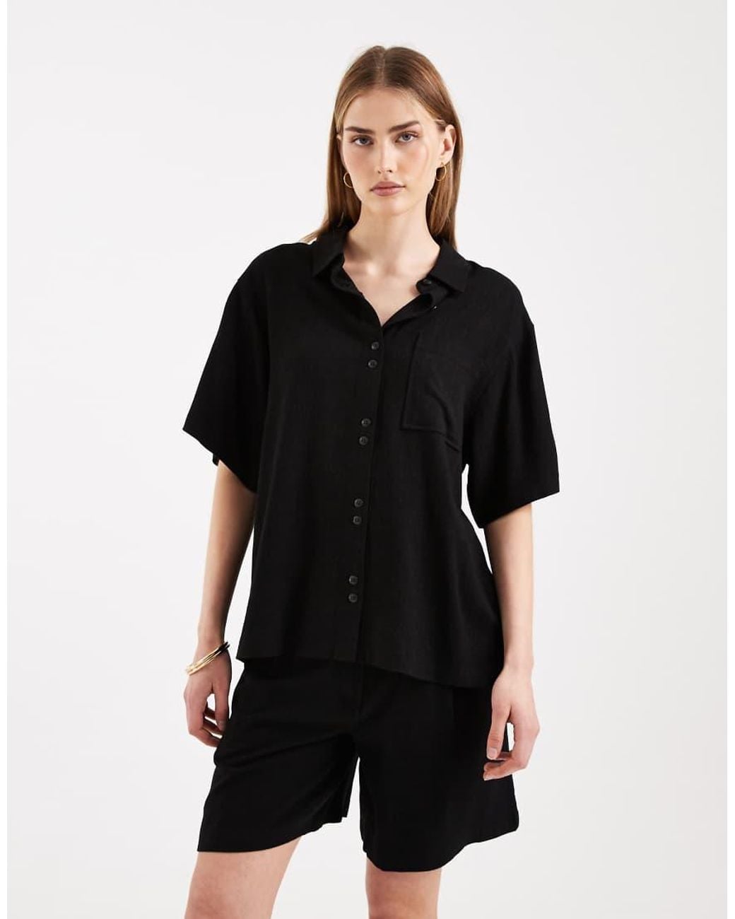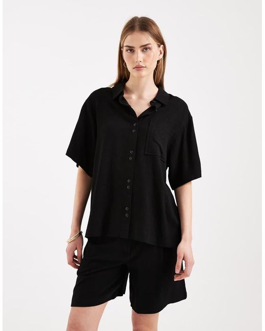 Tops by ASOS DESIGN Spread collar Button placket Short sleeves Chest pocket Tie fastening at back Relaxed fit. Viscose/Linen. Colour: black