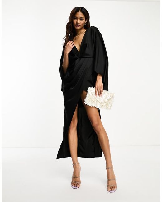 Women's Black Satin Batwing Pleat Midi Dress With Drape Skirt