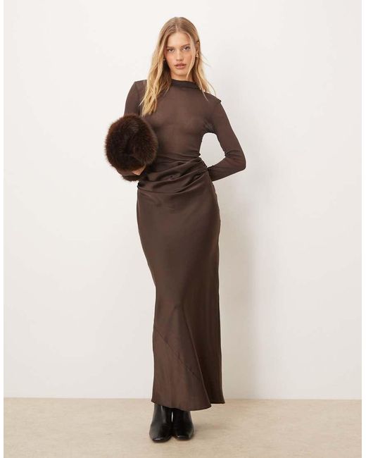 - Sheer High Neck Bodice Drape Satin Maxi Dress