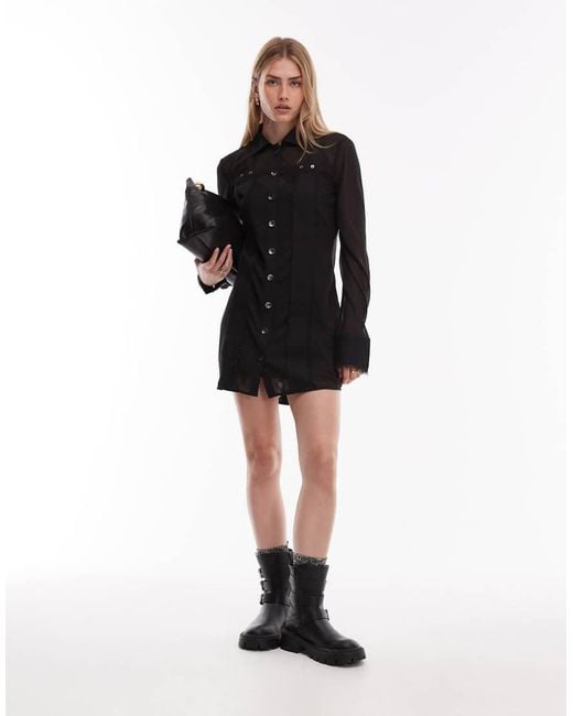 Women's Black Sheer Shirt Mini Dress With Contrast Twill Detail