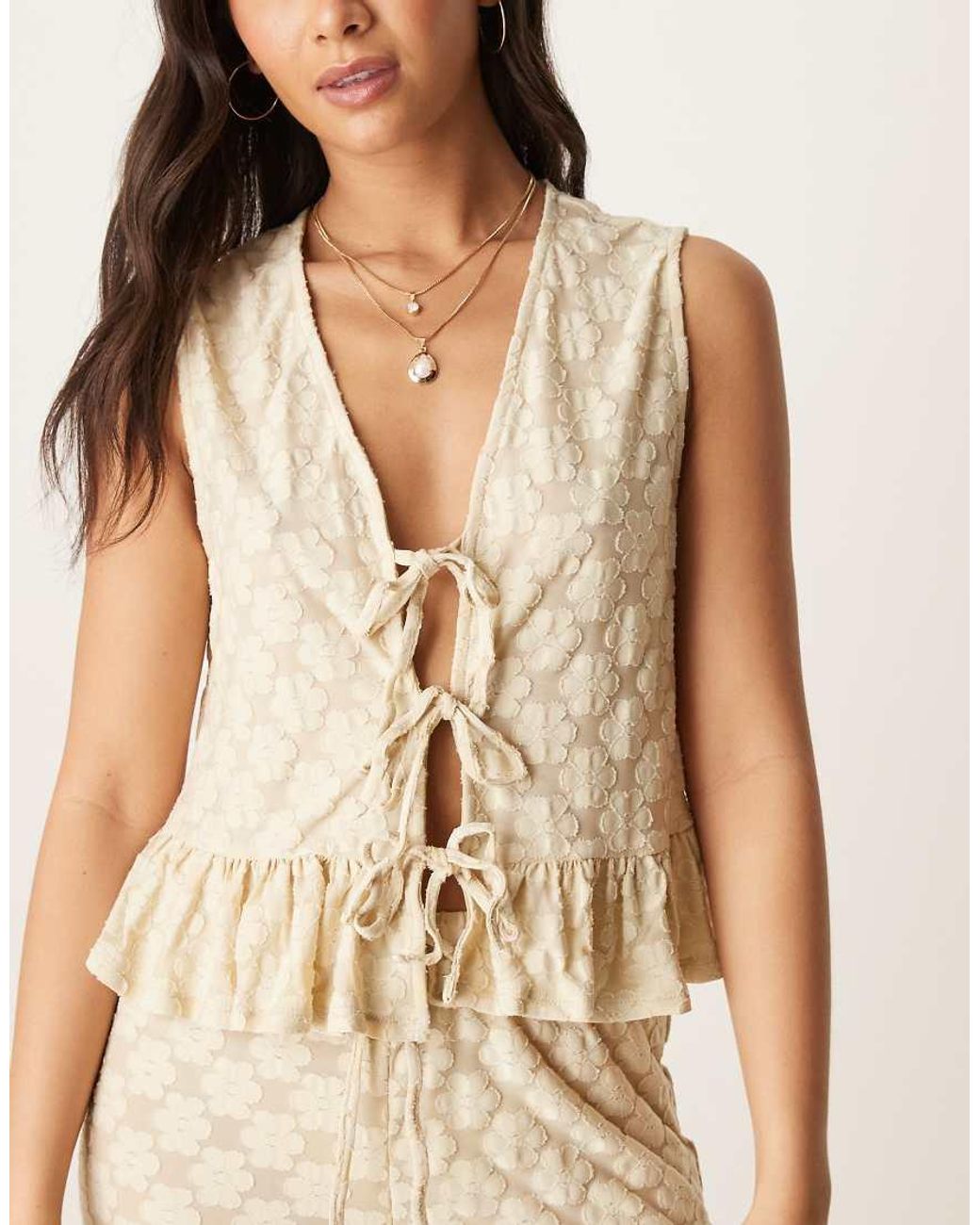 Floral Embroidery Tie Front Top Co-ord - Natural