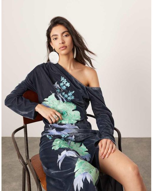 Women's Blue Velvet Floral Embroidered Off Shoulder Long Sleeve Midi Dress