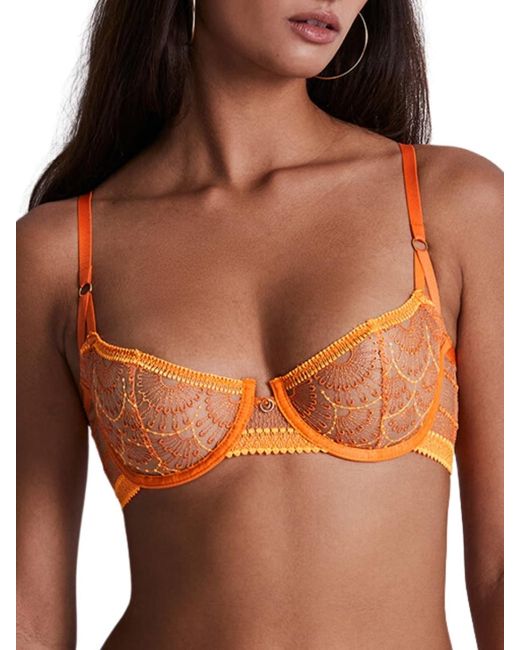 Aubade Pure Vibration Half Cup Bra. Underwired demi cup bra with intricate emboirdery, a comfortable semi sheer mesh back, and sheer decorative mesh cups. Matching briefs available. This item is recommended for hand wash only. Colour: orange