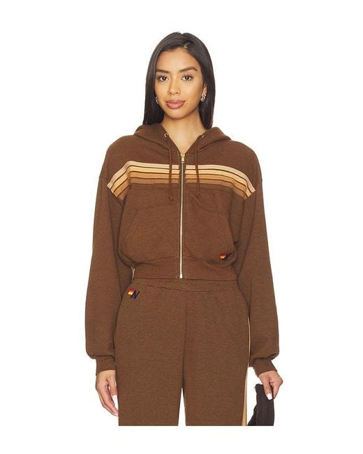 Aviator Nation 5 Stripe Cropped Zip Hoodie in Brown. Size L. Also in M, S, XL/1X, XS. Aviator Nation 5 Stripe Cropped Zip Hoodie in Brown. Size M, S, XL/1X, XS. 50% Polyester 38% Cotton 12% Rayon. Made in the US. Machine wash cold. Front zipper closure. Soft knit. ANAT-WK129. HDCRXRS5. Who doesn't have an obsession with vintage clothing? Paige Mycoskie, creator of Aviator Nation sure does. That's why she began studying the art of authentic vintage clothing and starting creating her own line of tee's, sweatshirts and hats to give the world that well worn feeling of so long ago.