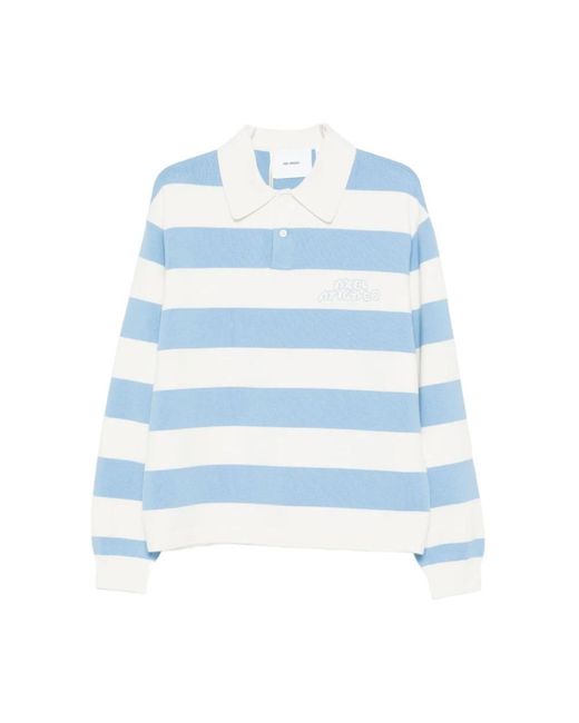 Axel Arigato Rey Polo Jumper is a knitted polo-style jumper in a merino wool–cotton blend, designed for refined smart-casual layering with a classic collar and button placket. Key attributes: White | Light blue | Merino wool and cotton | Breathable | Thermoregulating | Button placket | Knitted construction | Polo collar | Embroidered chest logo | Striped pattern | Composition & care: 50% Merino wool | 50% Cotton Colour: blue